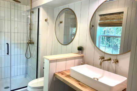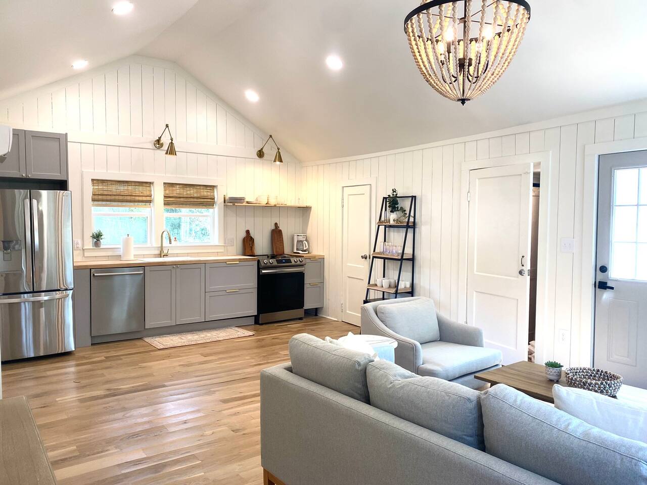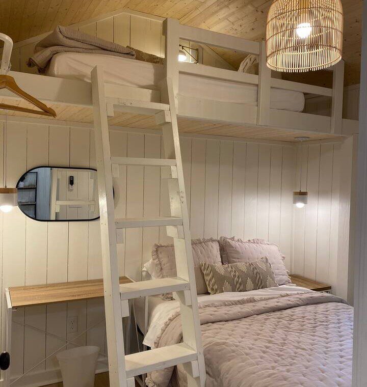 Beautiful natural light, vaulted ceilings, gorgeous chandelier, vertical shiplap, gold hardware and neutral, soothing decor. Let your eyes rest in this soothing abode. Relax in the open space making it easy to chat on the sofa while some cooks in the kitchen. Our smart ROKU tv allows you stream your own streaming accounts. Head to the master bedroom where a new king mattress awaits with its own ensuite bathroom and rainfall shower head. We have a cozy (ie small) second bedroom that has a full bed with a lofted twin mattress over the full bunk for a whimsical room that allows additional sleeping options. To sleep 3 in this room, I recommend kids or 2 adults understanding that one will have to climb to the lofted twin bed.