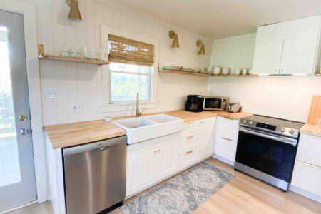 Back inside , you can head down the INTERIOR staircase to find another king bedroom sharing a full bathroom with a bunk room that has two sets of bunks to sleep 5. One is twin over twin and the other is twin over full. The last bedroom has a queen bed. Downstairs is a similar floorplan with open living, dining and smaller kitchen to enjoy as well as another half bathroom. The flamingo kitchen stores our fun cooking items for memory making – popcorn maker, homemade ice cream maker, blender and a large griddle for pancakes galore.